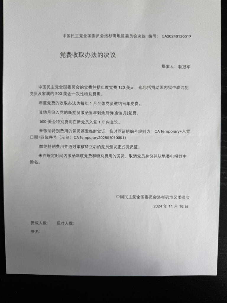 中国民主党全国委员会的党费包括年度党费120美元,也包括捐助国内狱中政治犯党员及家属的500美金一次性特别费用。